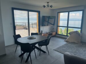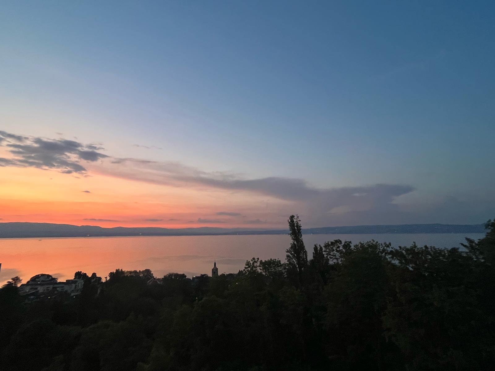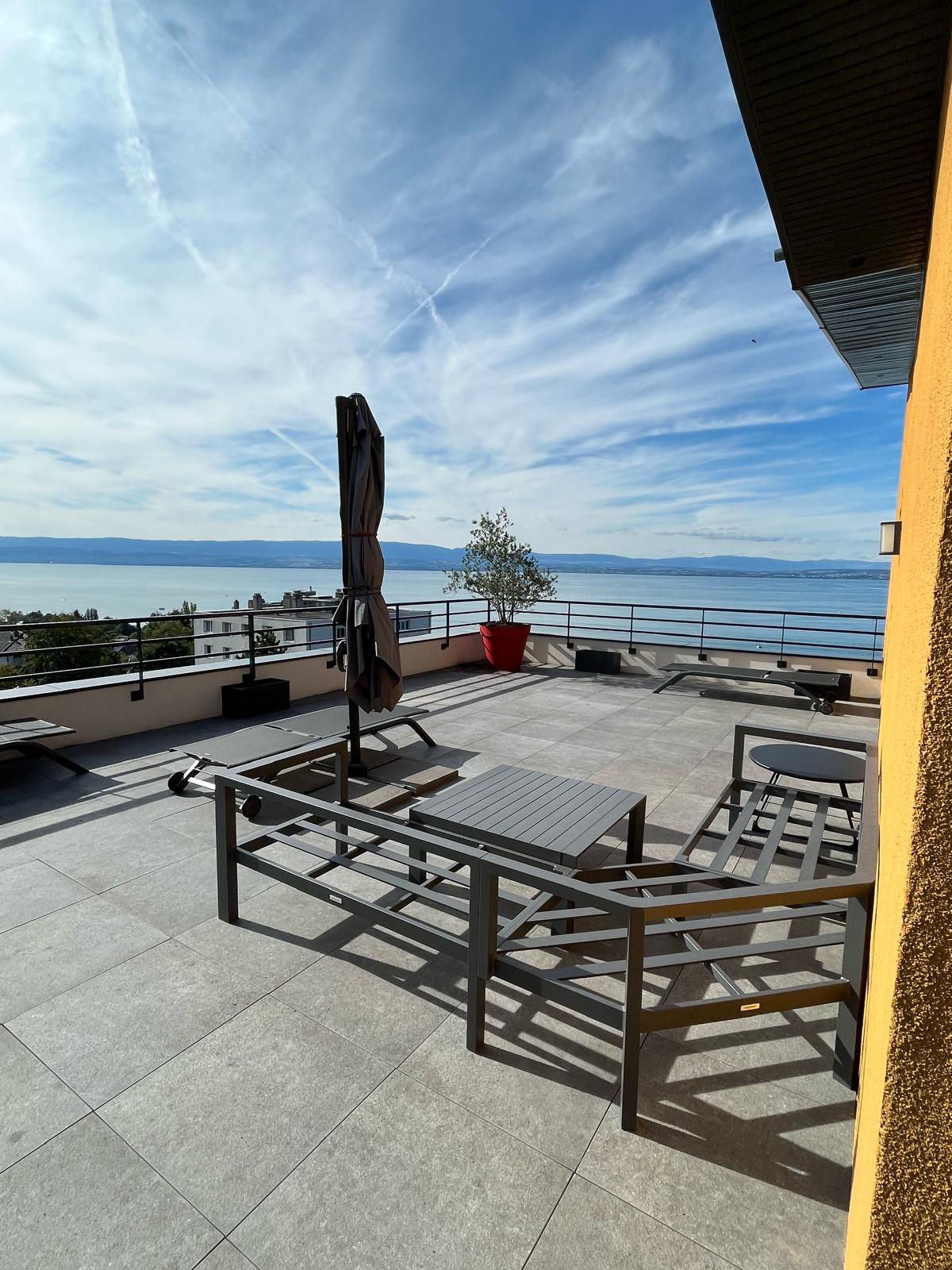 Sa terrasse enveloppante de 111 m², orientée sud et ouest, offre des vues lac panoramiques et des couchers de soleil spectaculaires.Les volumes sont généreux : un séjour avec cuisine ouverte de près de 45 m² baigné de lumière, deux chambres ouvrant sur un balcon nord avec également vue lac, deux salles d’eau raffinées, un WC séparé.